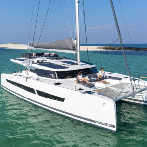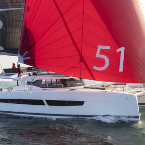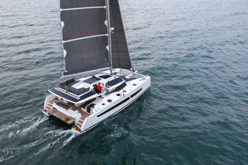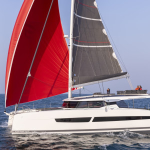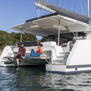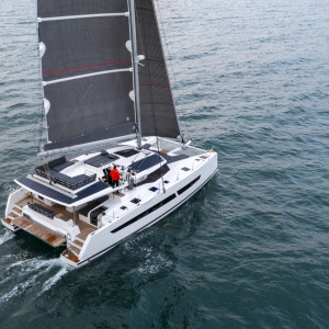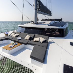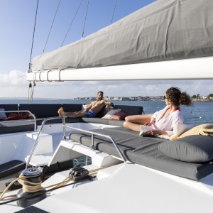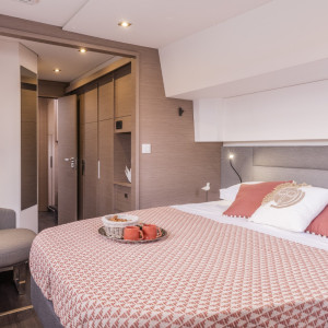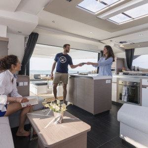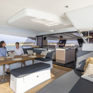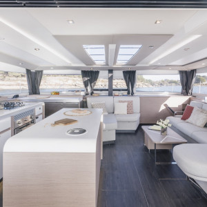 The completely redesigned Aura 51 deck plan marks a new era for the Fountaine Pajot range and provides even more space and comfort. A great novelty of this 51-foot cruising catamaran is its full walkway between saloon and cockpit. An innovation that facilitates the connection between the galley and the large cockpit table and gives you even more - the feeling of freedom and space that is characteristic of the Fountaine Pajot series.