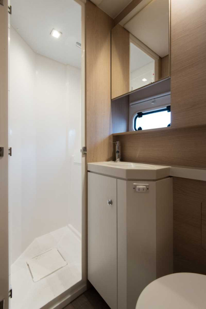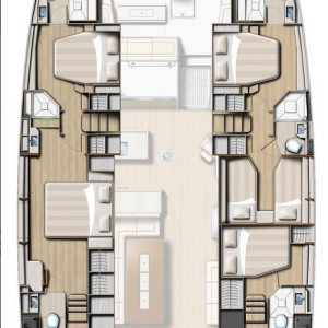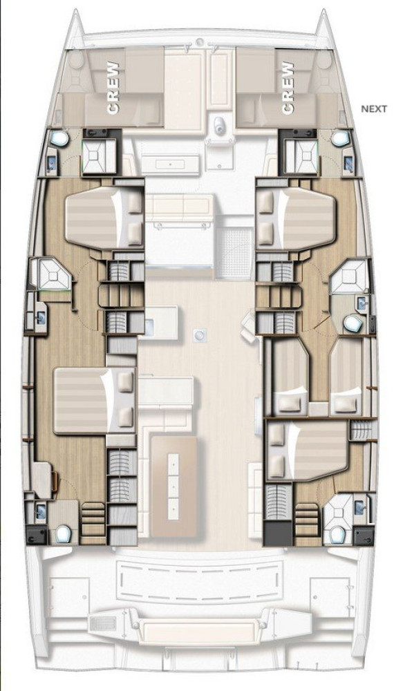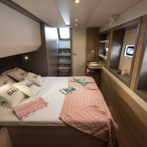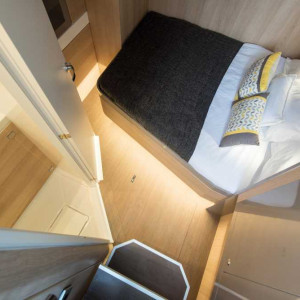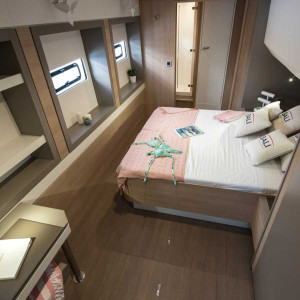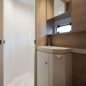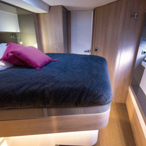 A unique salon offers an unparalleled amount of uninterrupted space and can be turned into a huge cockpit area by opening the large tilting glass door and side windows. The solid forward deck brings an incredible sunbathing area and a comfortable forward cockpit that can seat the entire crew while offering even greater comfort at sea. You can access the forward cockpit directly from the saloon, which adds to this living space’s value. There are 5 luxurious cabins with en-suite bathrooms awaiting you below deck while the crew has its separate cabin accessible directly from the deck.