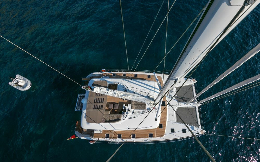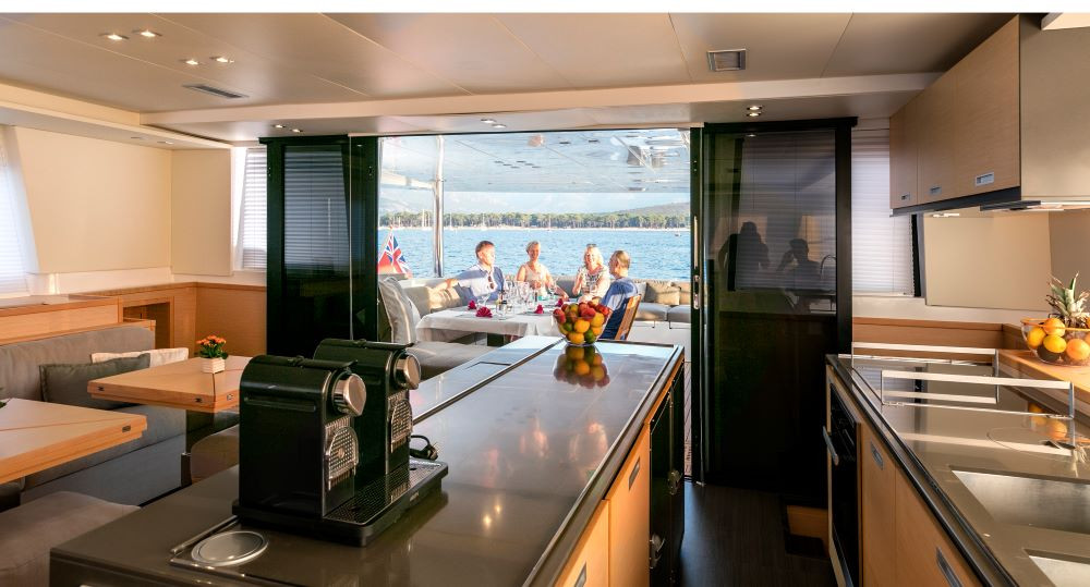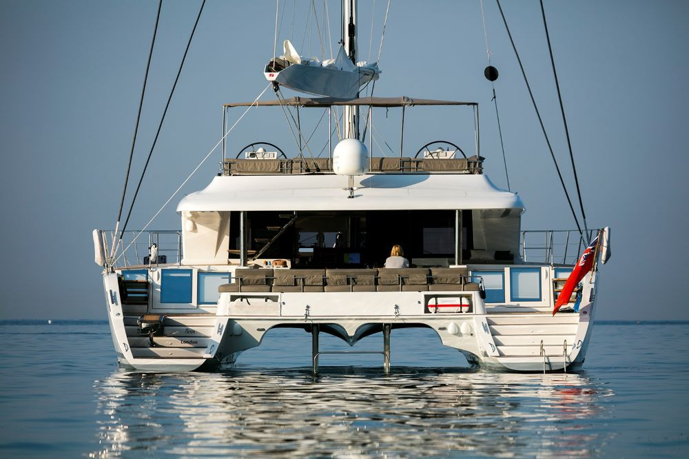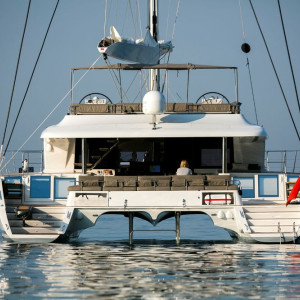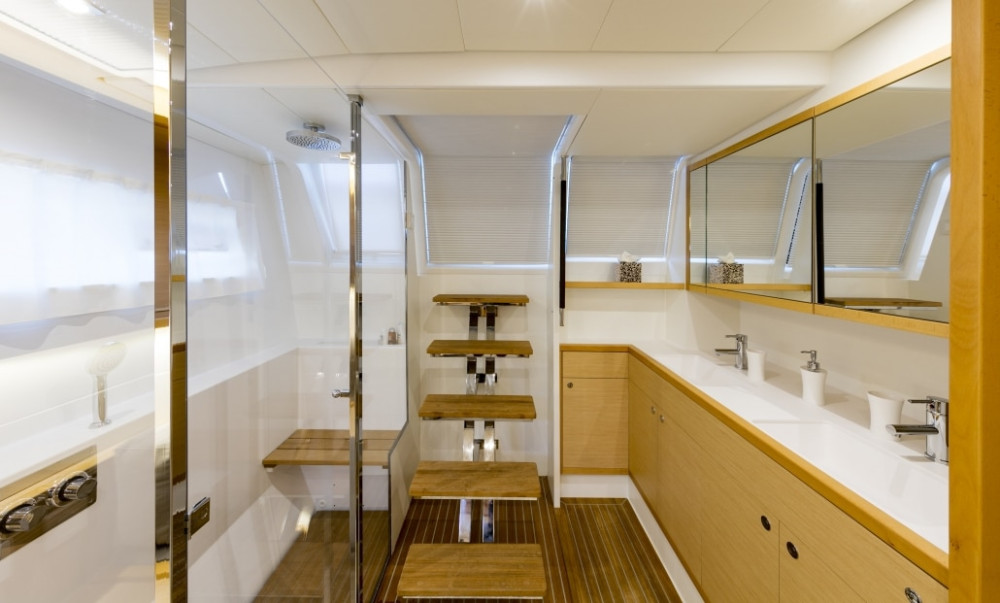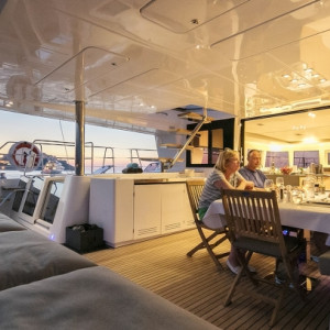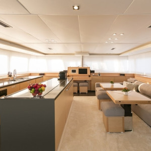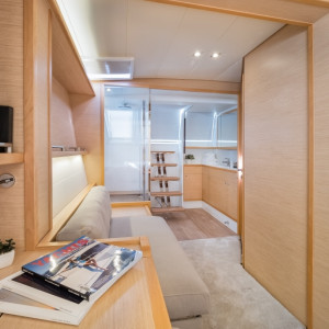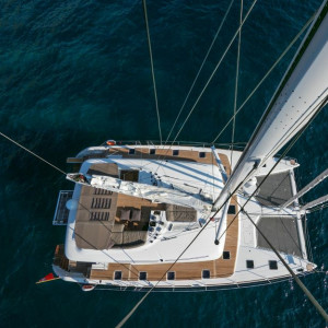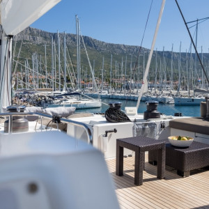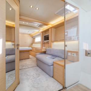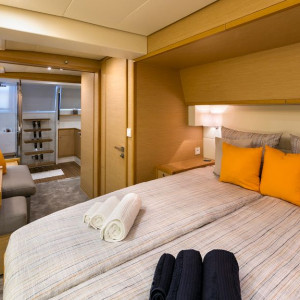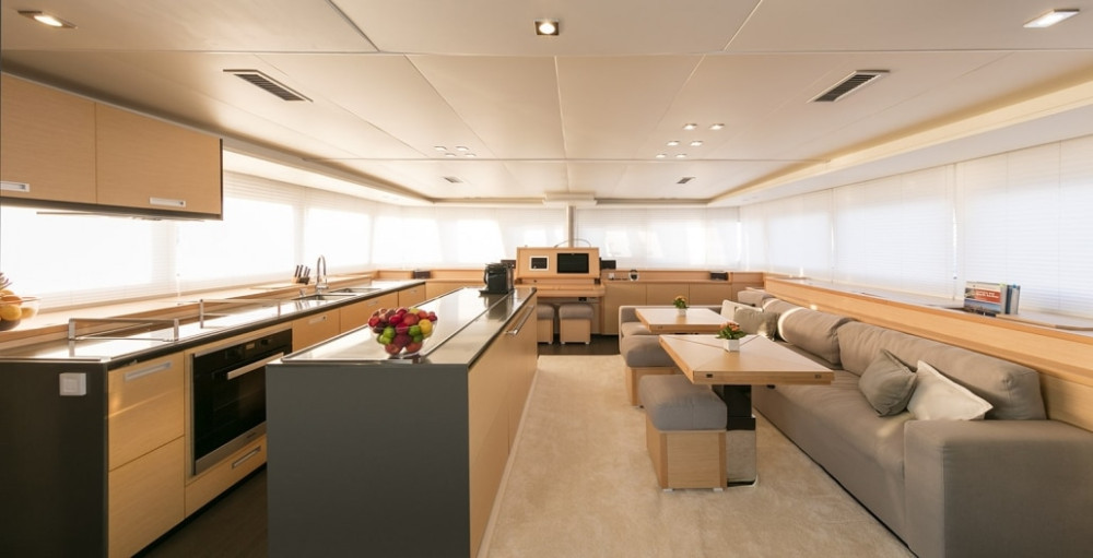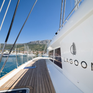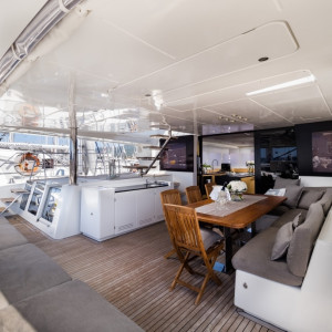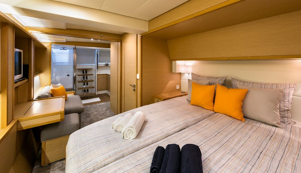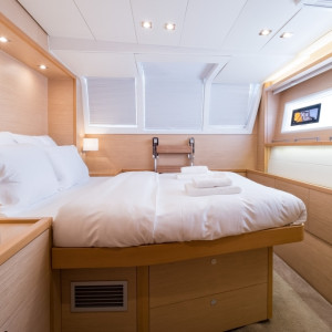 Charter Lagoon 620 in Croatia. TWIN has one master and three queen size bed, all ensuite, luxurious, well-designed cabins with side access to beds. Master cabin is equipped with Flat screen TV, ample closets, drawers, sofa and spacious bathroom (with separate head & double vanity). Furthermore, the main deck has three different social areas. Starting from the front has ample views of the water, immense saloon with clearly defined dining, relaxing, sitting and navigation areas. The covered aft section opens to the back and gives you access to the rear swimming platforms. Above, the flybridge deck is completely open, with large seating and lounging areas, providing you, your family & friends sunbathing opportunities.